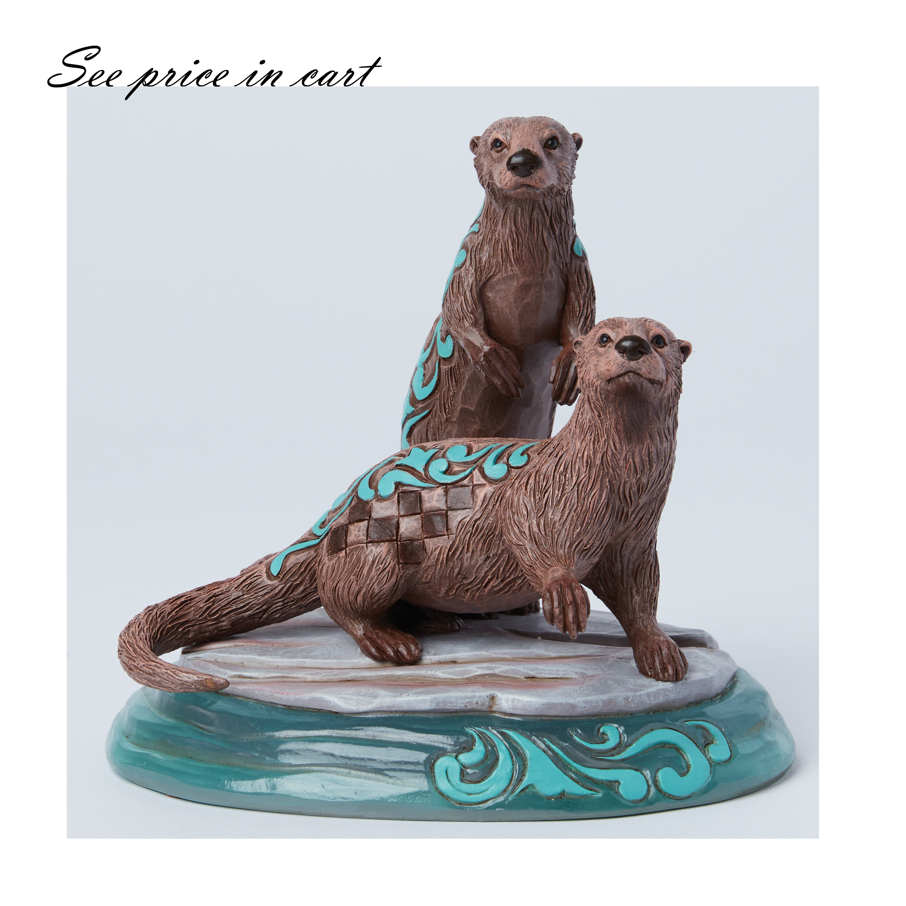 This striking line of designs by Jim Shore shines a light on the animal kingdom's beautiful and diverse species. Celebrate the playful otter by adopting its likeness into your home with this adorable pair of rosemale river otters on a resin stage.