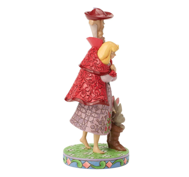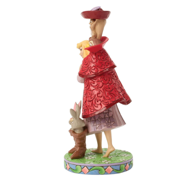 Aurora's forest friends transform into a man in a red coat as she searches for her prince. An owl, squirrel, and bunnies inside boots add charm to this captivating Jim Shore design, bringing the memorable movie scene to life with enchantment.