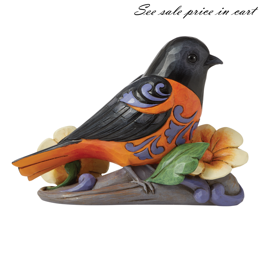 Birds are always a delight to watch. With alluring plumage and peaceful posture, they're often thought of as good omens and symbols of freedom. A Baltimore Oriole is the star of this Jim Shore piece, mesmerizing the eye with it's commanding presence.