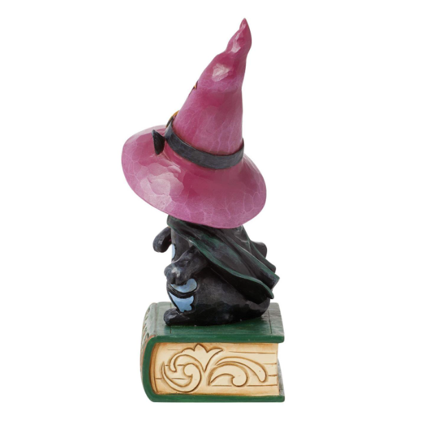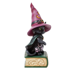 Embrace magic this Halloween with this charming pint Jim Shore figurine of a black cat in a witch's hat and cloak but too cute to spook. Perched atop a bound book of spells, the adorable feline adds not too scary charm to your Halloween decor