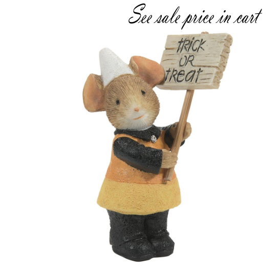 Add some sweetness to your home this holiday with Tails with Heart. Holding a wooden sign reading Trick or Treat this little mouse dresses as a piece of candy corn for Halloween. Bring the festive fall spirit indoors with this darling miniature.