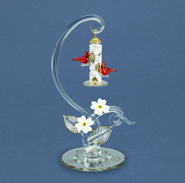 • Handcrafted figurine of two cardinals perched on a bird feeder, placed on a hand beveled glass mirror decorated with a glass vine and white porcelain flowers
