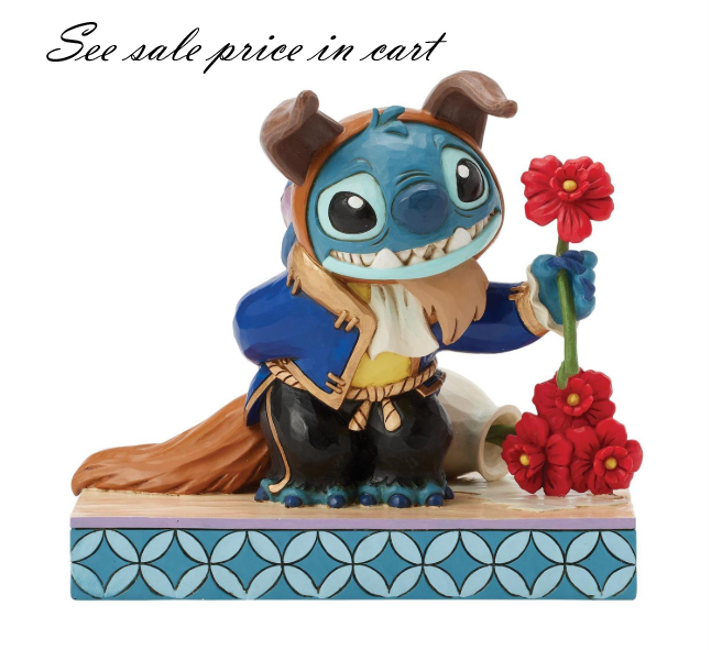 In this charming Jim Shore design, Stitch takes on the role of the Beast from Disney's beloved tale, dressed in the iconic blue suit. Behind him, Scrump stands in as his imprisoned Belle. With an adorable smile, Stitch presents a flower.