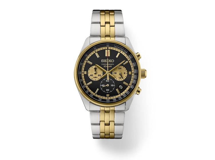 From the Essentials Collection. Inspired by motor sports, this dynamic chronograph features a black dial with bold, highly legible gold subdials at 3 and 9 o’clock styled to suggest a racecar instrument panel. Framed by a black tachymeter outer ring, the dial also offers a date calendar as well as a 24-hour subdial. The chronograph provides measurement of up to 60 minutes of elapsed time in 1/5-second increments. Crafted of stainless steel with mirror and hairline two-tone finish and tri-fold push button release clasp. 10 bar, 100M Water Resistant.