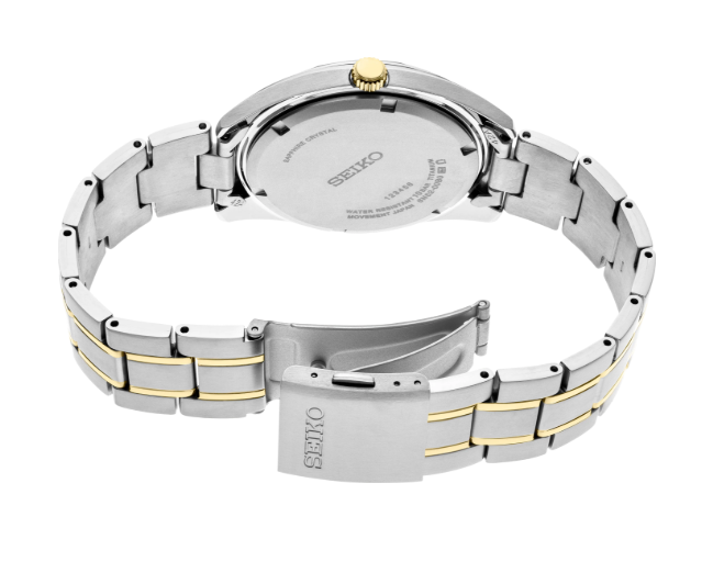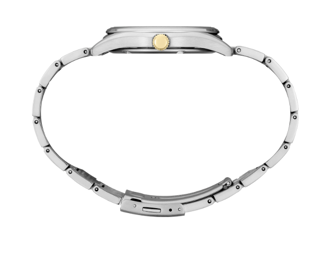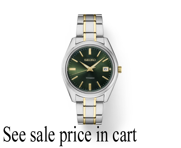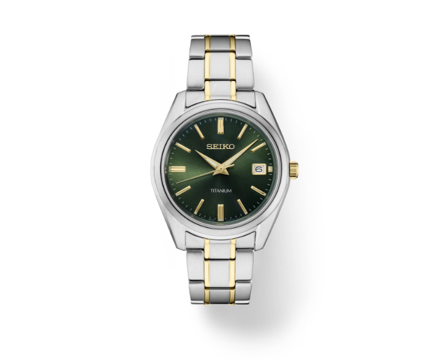 From the Essentials Collection. Offering classic dress/sport designs, the Essentials Collection provides the ideal solution for everyday wear. Crafted of durable and light-weight titanium in two-tone finish, this perfectly tailored watch features a contemporary minimalist green sunray dial with gold accents and date calendar, for a superb blend of clarity and wearability. The sapphire crystal adds superior scratch resistance. 10 bar, 100M Water Resistant.