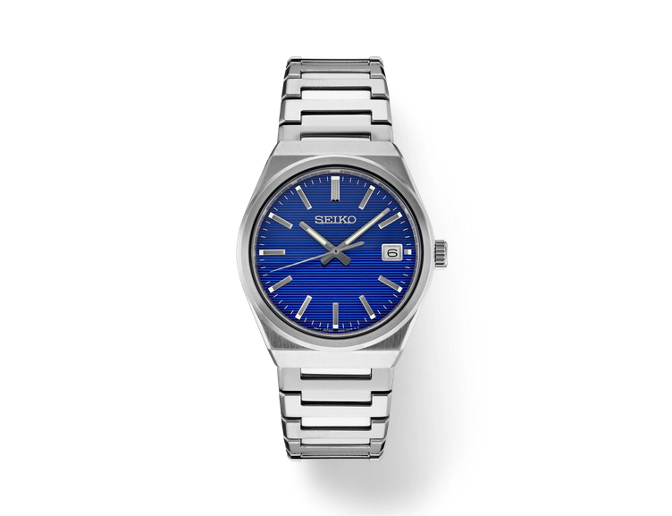 From the Essentials Collection. An updated classic, this sleekly angled watch features a vibrant blue pressed-pattern dial with simple stick indices, date calendar, and LumiBrite hands and markers. Crafted of stainless steel with a scratch-resistant sapphire crystal, this versatile timepiece includes a secure screwdown caseback and tri-fold push button release clasp. 10 bar, 100M Water Resistant.