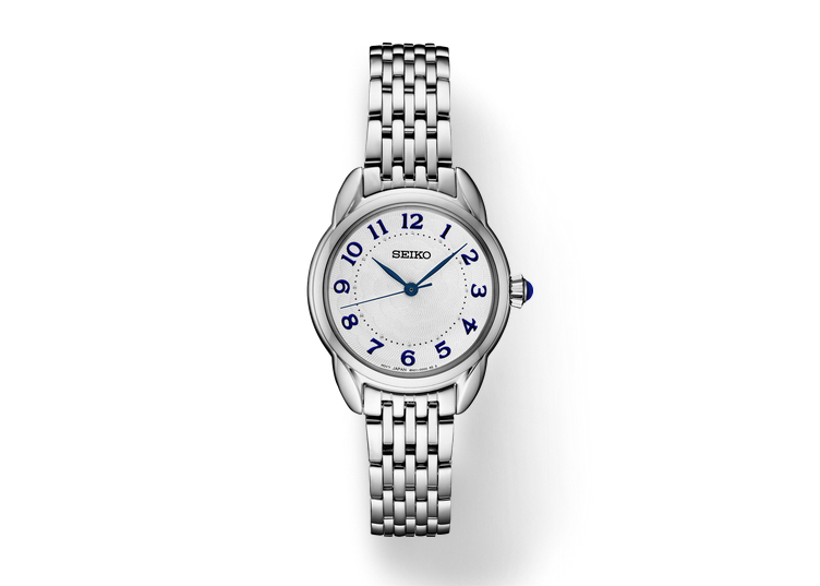 From the Essentials Collection. With elegant, jewelry-inspired styling, this gracefully updated watch features a sophisticated white dial with subtle center radial pattern, blue hands, and blue Arabic numerals for easy reading of the time at a glance. Including a classic cabochon crown, this beautifully balanced design is crafted of stainless steel and offers a tri-fold push button release clasp. 5 bar, 50M Water Resistant.
