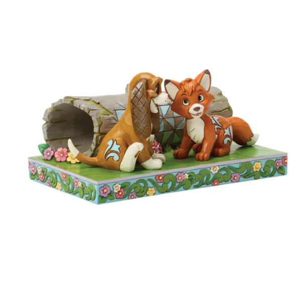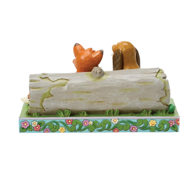 Celebrate the unlikely friendship between Fox and the Hound in this charming Jim Shore scene. As they play in the woods, Jim Shore's iconic rosemaling, patchwork patterns, and floral details bring the vibrant scene to life.