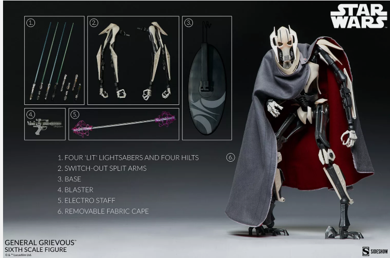 Engineered with meticulous attention to detail, the General Grievous Sixth Scale Figure is fully articulated to achieve dynamic and intimidating postures, recreating all of your favorite villainous moments from the Star Wars saga. From head to toe, the Confederacy’s Supreme Commander measures 16” tall with a detailed cybernetic body with clawed feet and multi-jointed limbs. Grievous also includes a removable grey fabric cape with a red inner lining that features pockets for storing stolen lightsabers.