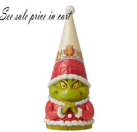 Known for his gnomes, Jim Shore presents his newest garden guardian crafted with Dr. Seuss flair. Wearing a flower adorned Santa hat, the Grinch folds his hands mischievously as he plots to steal all the presents in the room. Beware holiday hi-jinks!