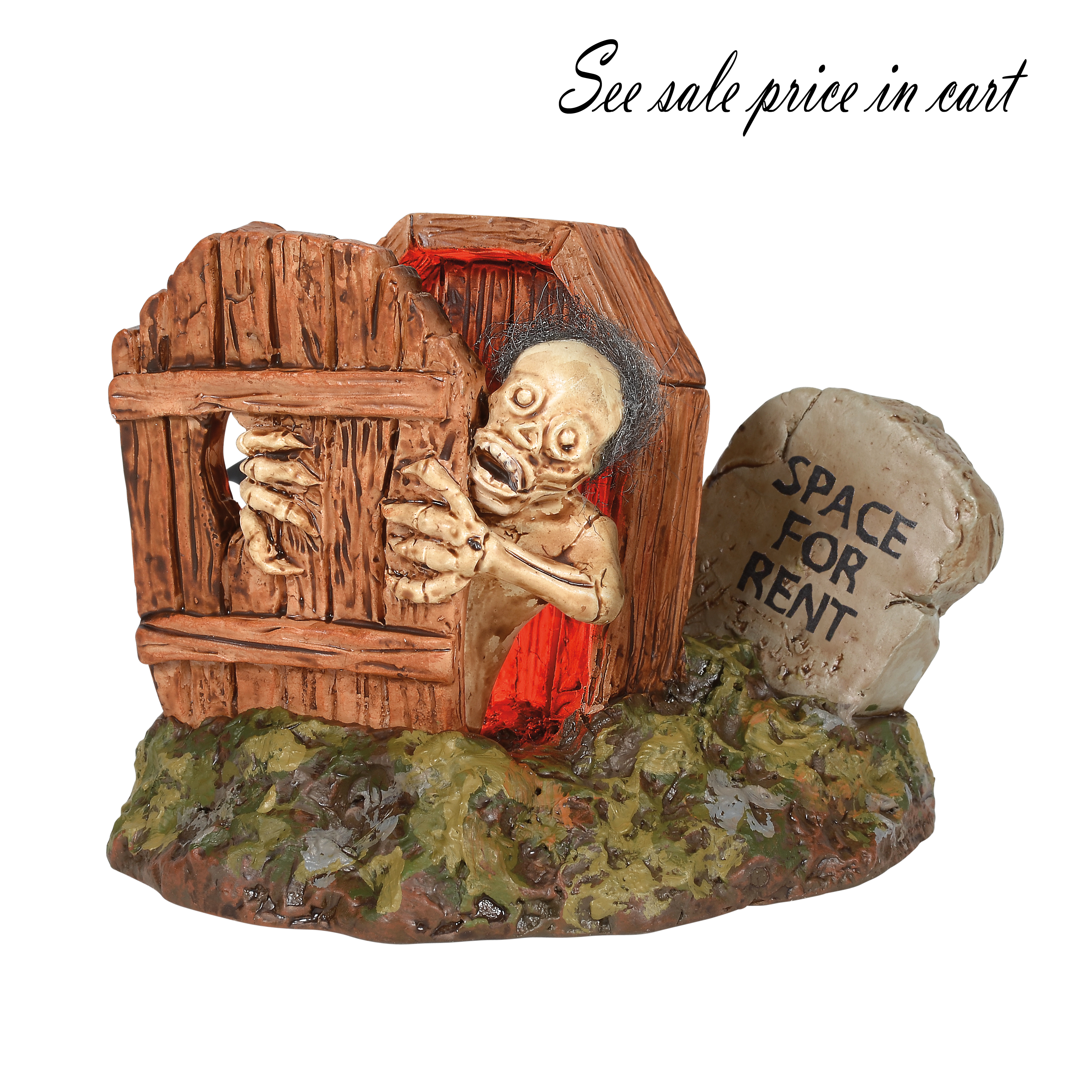 Fun halloween yard decor for your Village, skelleton seams to be escaping from a lit grave. This general accessory is hand-crafted, hand-painted, resin. Battery box included, 2 C batteries required.
