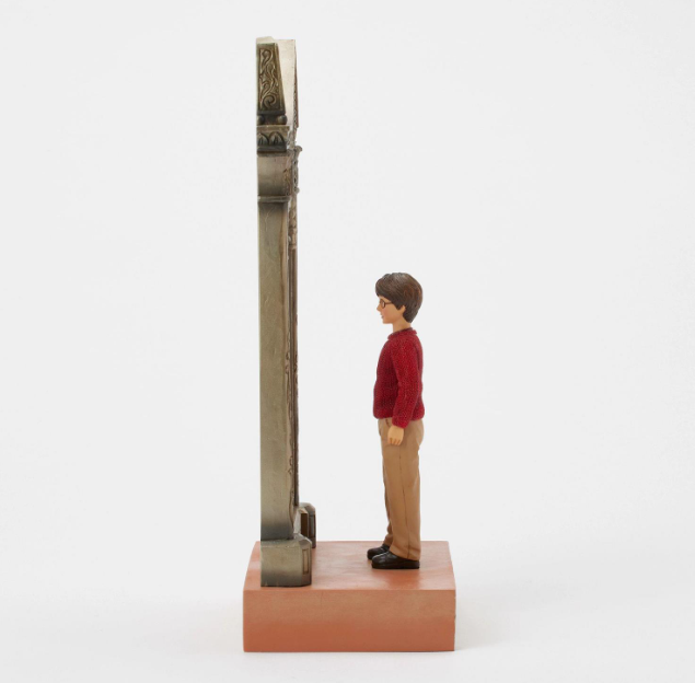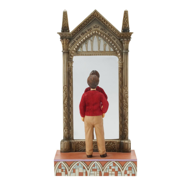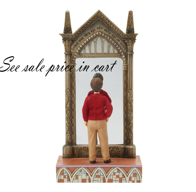 This captivating Jim Shore scene depicts a young Harry Potter gazing into the enchanted Mirror of Erised, where he sees himself holding the Sorcerer's Stone. Crafted with folk art motifs, this magical piece captures the wonder of the wizarding world.