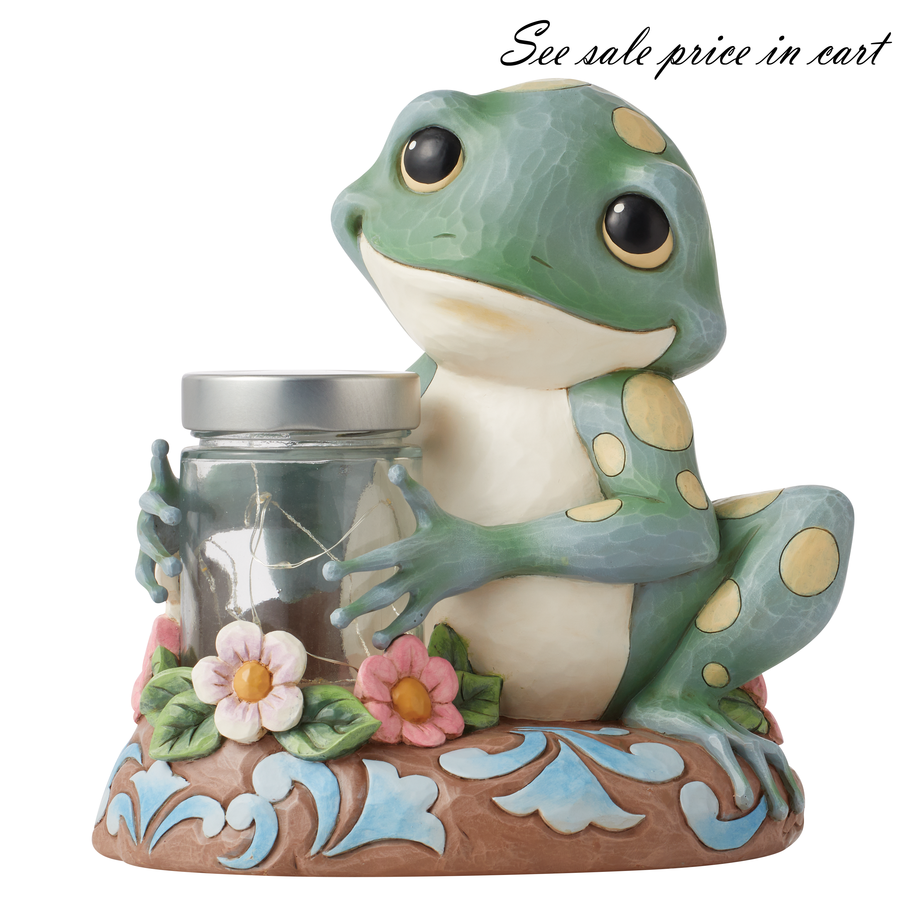 This adorable frog holds a jar of glowing fireflies. Creatively crafted by Jim Shore, the garden frog's firefly jar glows with LED lights. With flowers and rosemaling, this figurine is a charming addition to any nature lover's home.