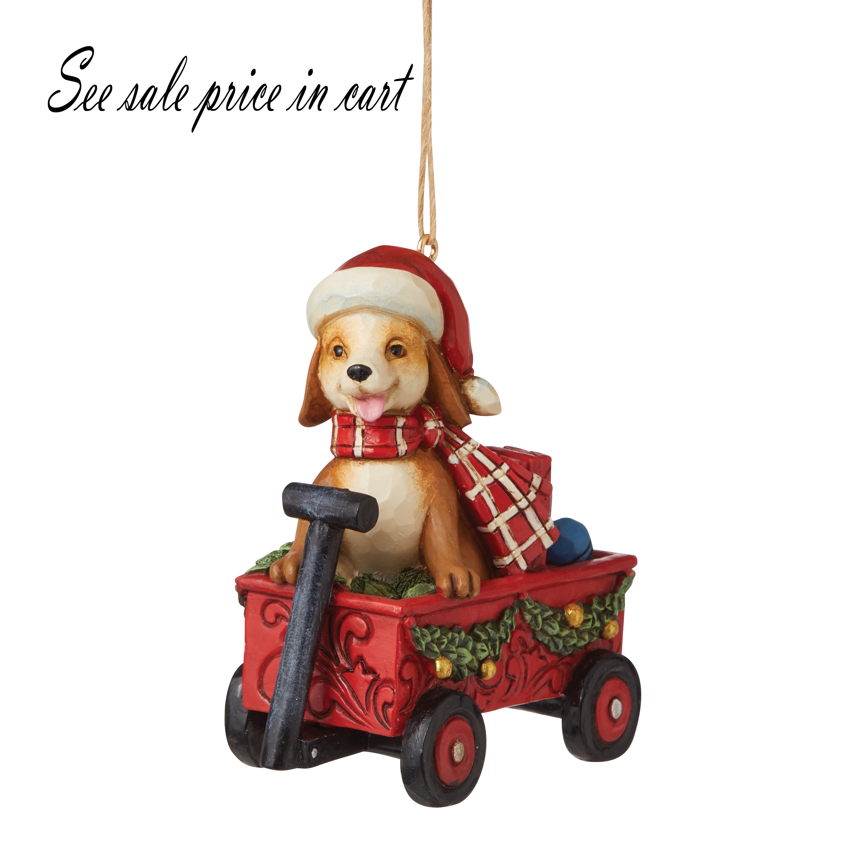 This little red wagon is filled with holiday gifts, including a very special surprise. Panting excitedly, this precious puppy can't wait to arrive at his new home. Give the gift of love this season with this Country Living by Jim Shore ornament.