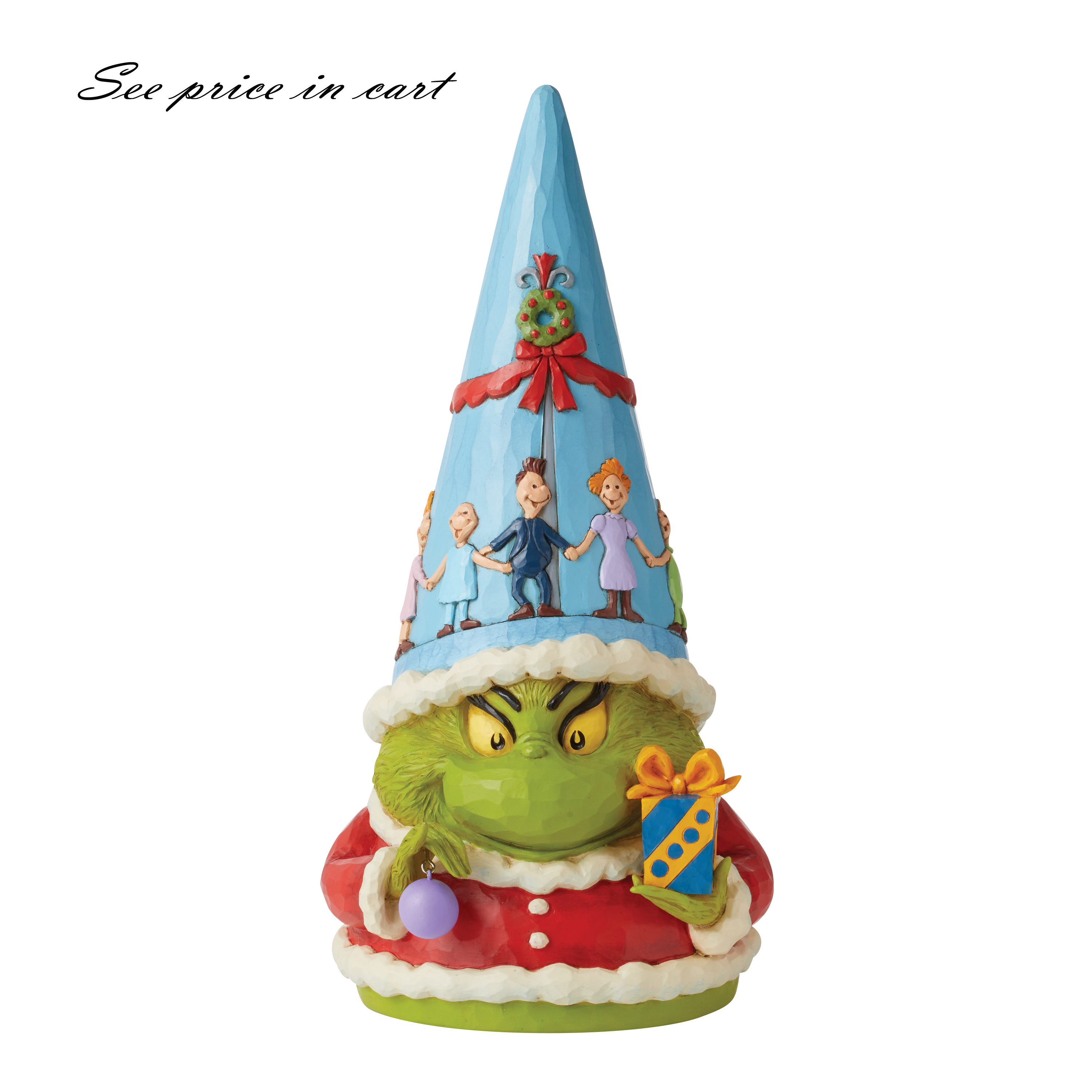 Wearing his infamous grin, The Grinch shrinks several sizes for this lovable 14 H gnome statute by Jim Shore. Disguised in Santa's coat, he's eager to sneak your Christmas tree this season. Perhaps you'll sway his heart before he steals your presents!