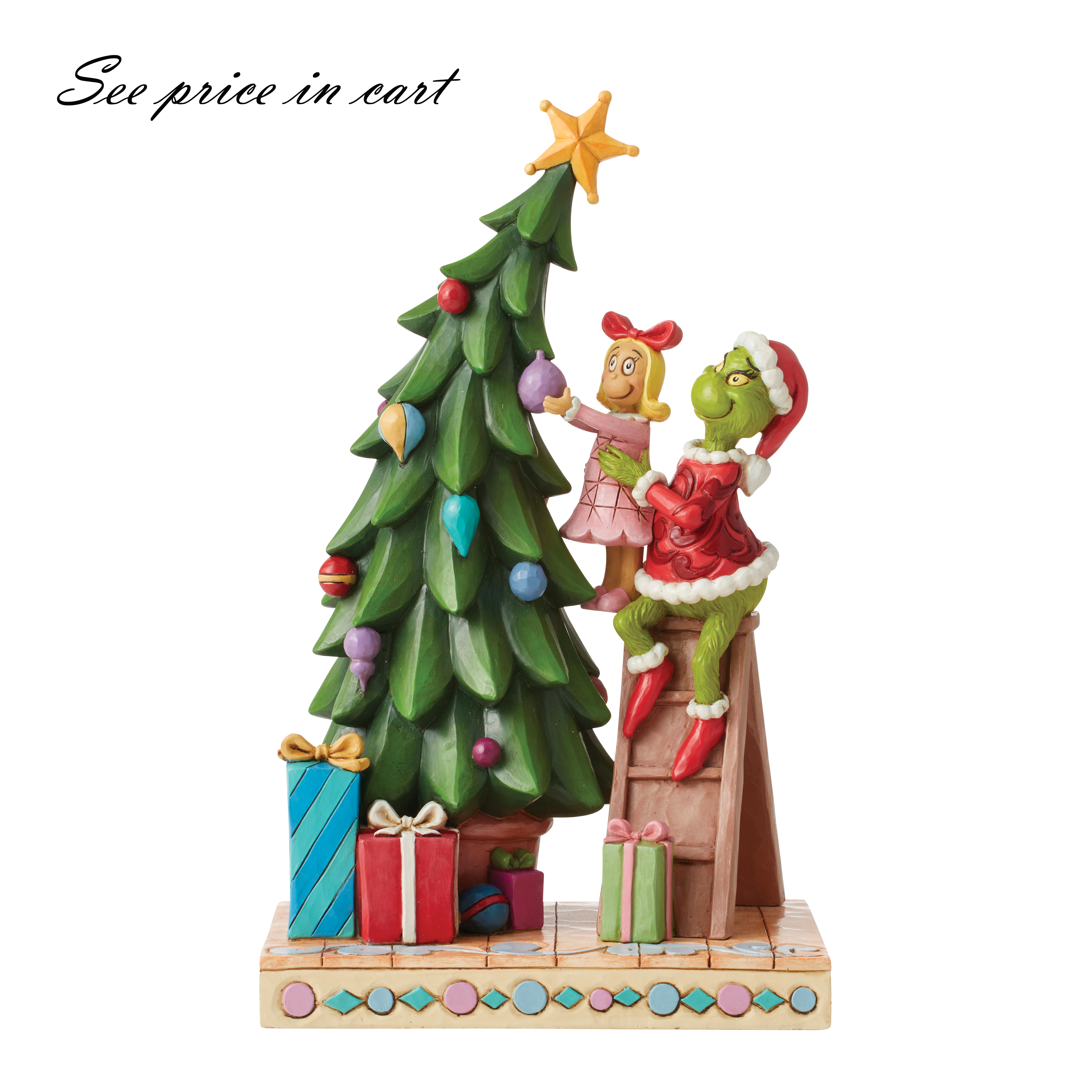 With a bigger heart, the Grinch turns over a new leaf to help instead of harm. In this heartwarming design by Jim Shore, the Grinch gives Cindy Lou Who a boost to decorate a Christmas tree. With a sincere smile, the holidays have grown brighter.