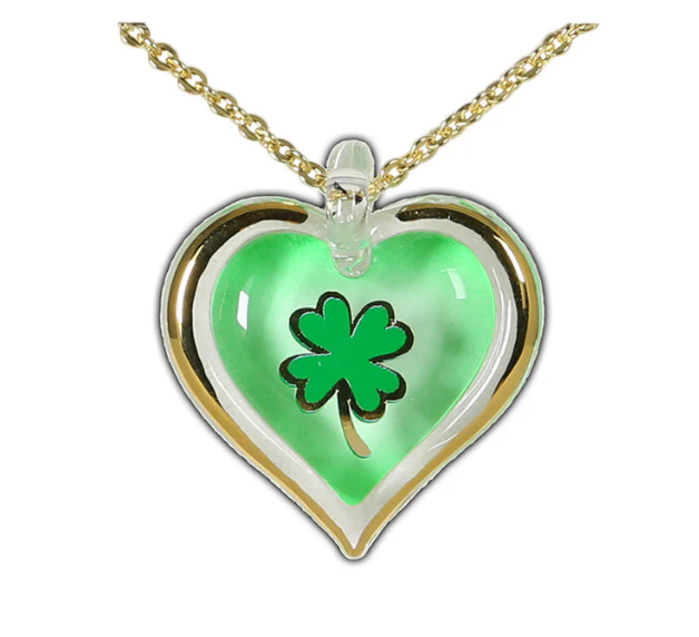• Gold trimmed Lucky Heart pendant accented with a four-leaf clover hanging on a 18" gold plated chain.