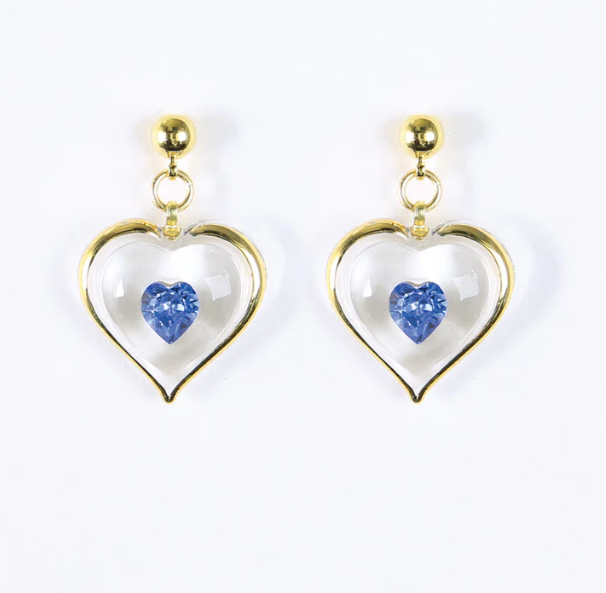 • Heart shaped post earrings accented with blue heart-shaped crystals.