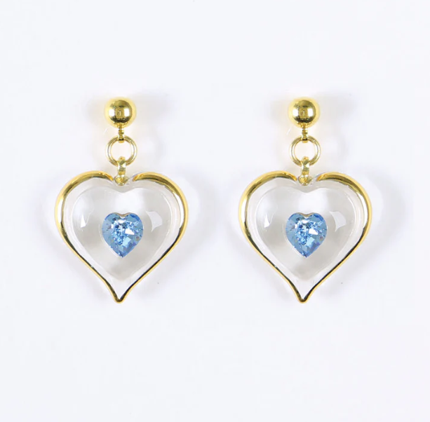 • Heart shaped post earrings accented with light blue heart-shaped crystals.