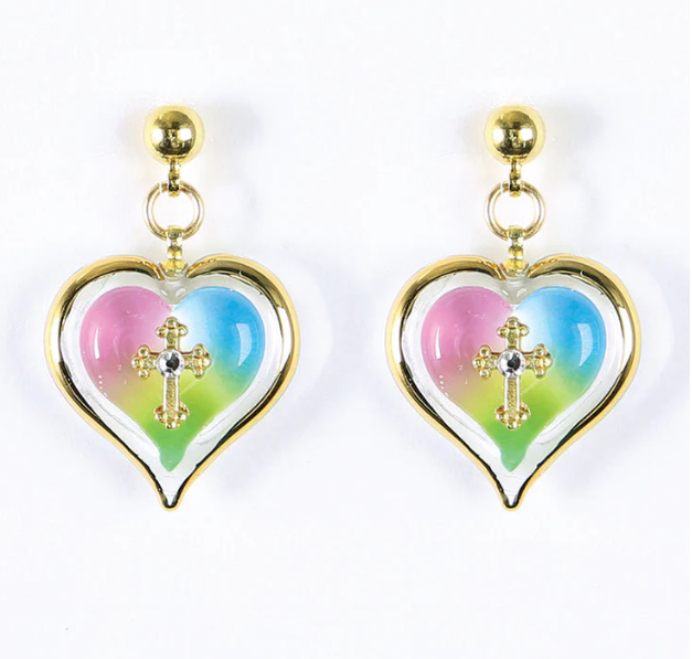 • Handcrafted post earrings, air-brushed rainbow-hued heart adorned with a gold cross.