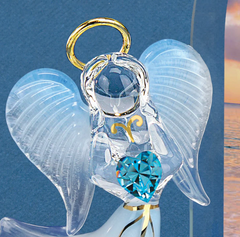 • Handcrafted figurine of an angel holding a heart-shaped blue crystal , placed on a hand beveled glass mirror with decorative back plate