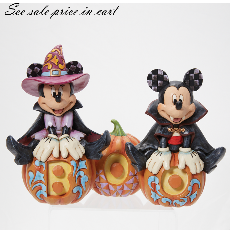 Designed by Jim Shore, Disney's Mickey and Minnie Mouse Jump over carved pumpkins that form the glow in the dark word Boo ! The pair don wide smiles as Minnie is a darling witch while Mickey is the count of cuteness.