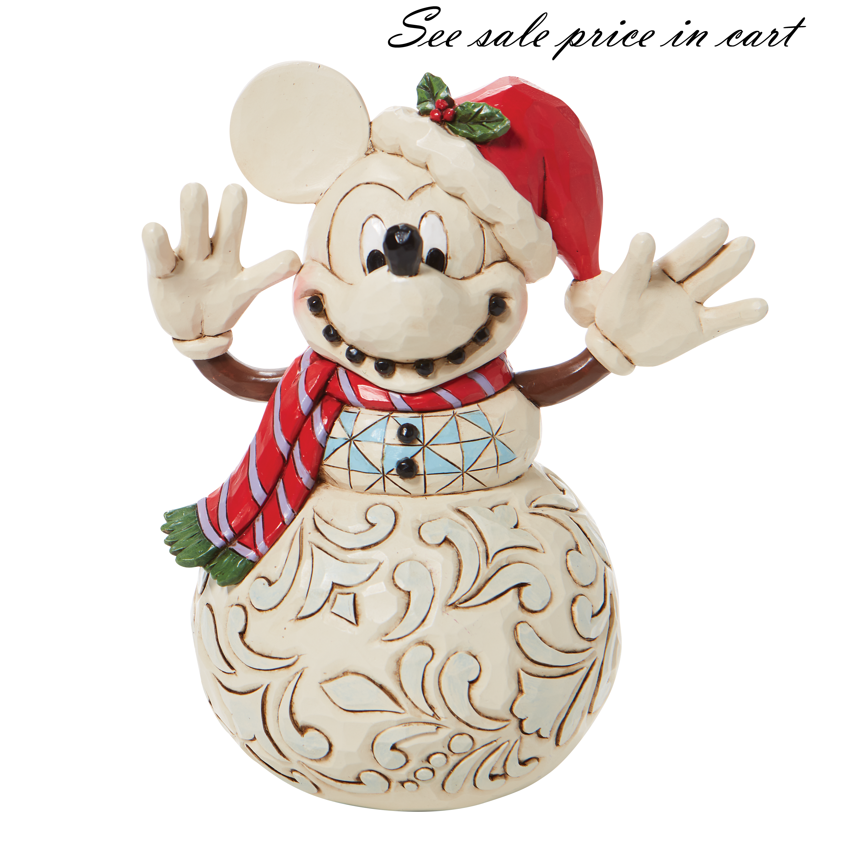 Is that Mickey Mouse or Mickey the Snowman? Dressed in a hat and scarf this snow creation resembles its maker. Designed by Jim Shore, this charming snowman makes a marvel of a Christmas ornament. Hang it in your tree pal!