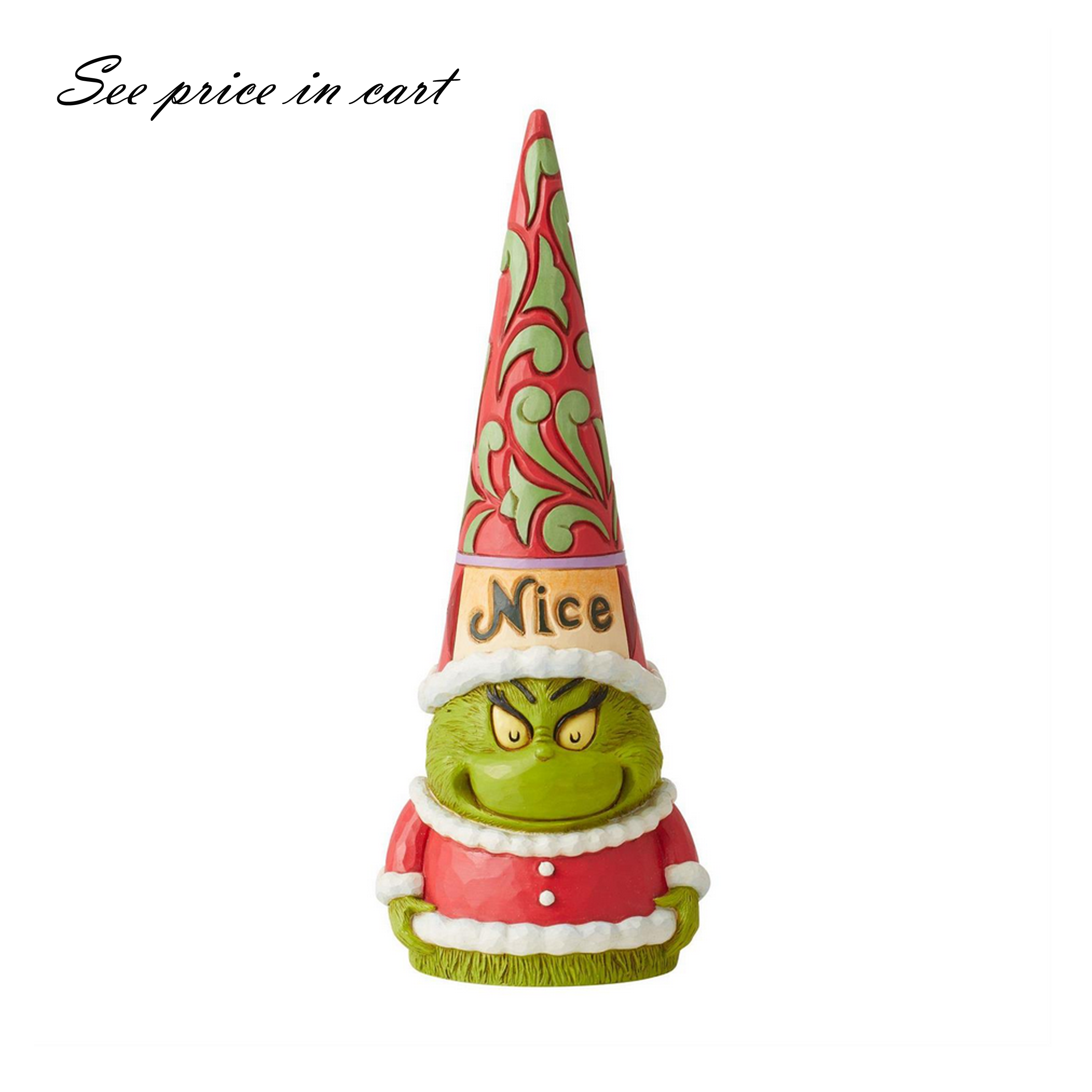 Known for his gnomes, Jim Shore presents his newest garden guardians crafted with Dr. Seuss flair. This two sided piece boasts a rosemaled hat and Santa suit. One side features a sweet eyed and smiling nice Grinch, while the other frowns naughtily.