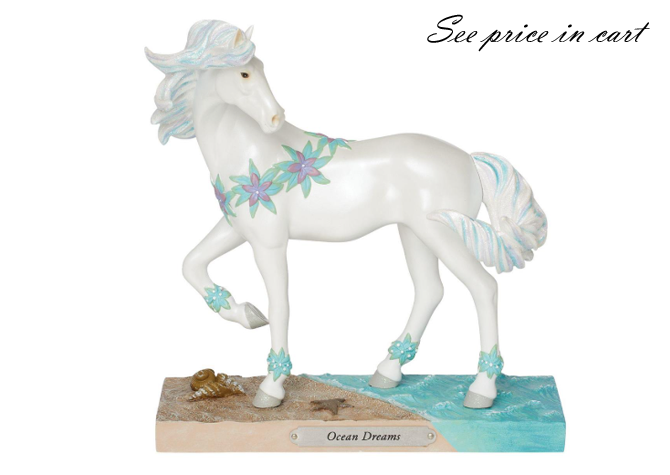Striking at the shoreline, this pearlescent pony inspires tranquility. With sparkling blue green highlights, this enchanting 7.5 inch statuette by the Trail of Painted Ponies is an ocean dream. She seems to sparkle covered in sea anemone flowers.