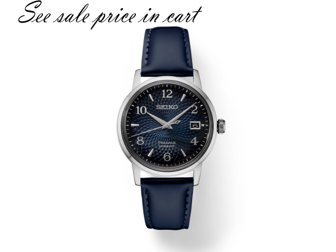 Seiko Presage Cocktail Time. Offering the finest in Japanese mechanical watchmaking, the Presage Collection blends precision technology with superior craftsmanship and design. Taking a more playful approach to the popular Cocktail theme line, this delightful watch is part of a group reflecting the casual charm of a vacation bar. Inspired by the Old Clock cocktail, its gradated deep blue dial features a pressed pattern reminiscent of the light reflected by a classic cocktail glass, as well as numerals styled to recall the printing on a vintage liquor label. The 23-jewel movement, with manual and automatic winding capability, beats at a frequency of 21,600 vibrations per hour, with a power reserve of approximately 41 hours. Crafted of stainless steel, this distinctive timepiece includes a calendar, box-shaped crystal, screwdown see-through caseback, smooth blue leather strap and tri-fold push button release clasp. 5 bar, 50M Water Resistant.