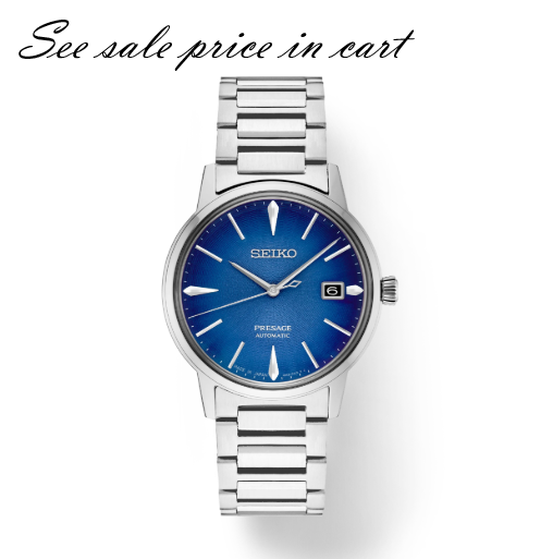 Seiko Presage Cocktail Time. Offering the finest in Japanese mechanical watchmaking, the Presage Collection blends precision technology with superior craftsmanship and design. Inspired by the vibrance of the city’s modern lounges, the newest Cocktail Time designs express the excitement of today’s Tokyo, with fresh styling and colors. Highlighted by a vivid blue dial with gradated tones, pressed pattern and gloss finish evoking the Aviation cocktail, this elegant design features a 23-jewel automatic movement, with manual winding capability, that beats at a frequency of 21,600 vibrations per hour, with a power reserve of approximately 41 hours. Crafted of stainless steel, this distinctive timepiece includes a calendar, box-shaped crystal, screwdown see-through caseback and double deployment clasp with push button release. 5 bar, 50M Water Resistant.