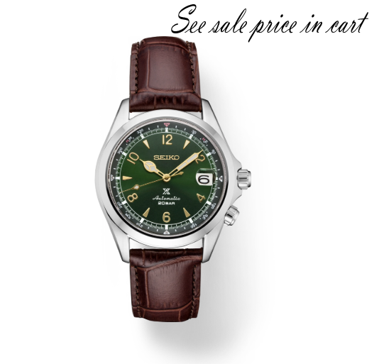 From the Prospex Collection. Designed for those who treat life as the ultimate adventure, the Seiko Prospex line follows every challenge with technological excellence and style. A modern re-imagining of Seiko's first sport watch, introduced in 1959, this distinctive timepiece is an upgrade of a highly successful Spring 2019 limited edition. Equipped with a rotating inner compass bezel for outdoor adventure, this unique design features a sunray-finish green dial with gold accents, LumiBrite hands and markers, magnified date window, and sapphire crystal with anti-reflective coating on the inner surface. The 24-jewel automatic movement beats at a frequency of 21,600 vibrations per hour, with a power reserve of approximately 70 hours, and can be wound manually or automatically. Crafted of stainless steel, with brown leather strap, secure tri-fold push button release clasp, screwdown crown and see-through caseback. 20 bar, 200M Water Resistant.