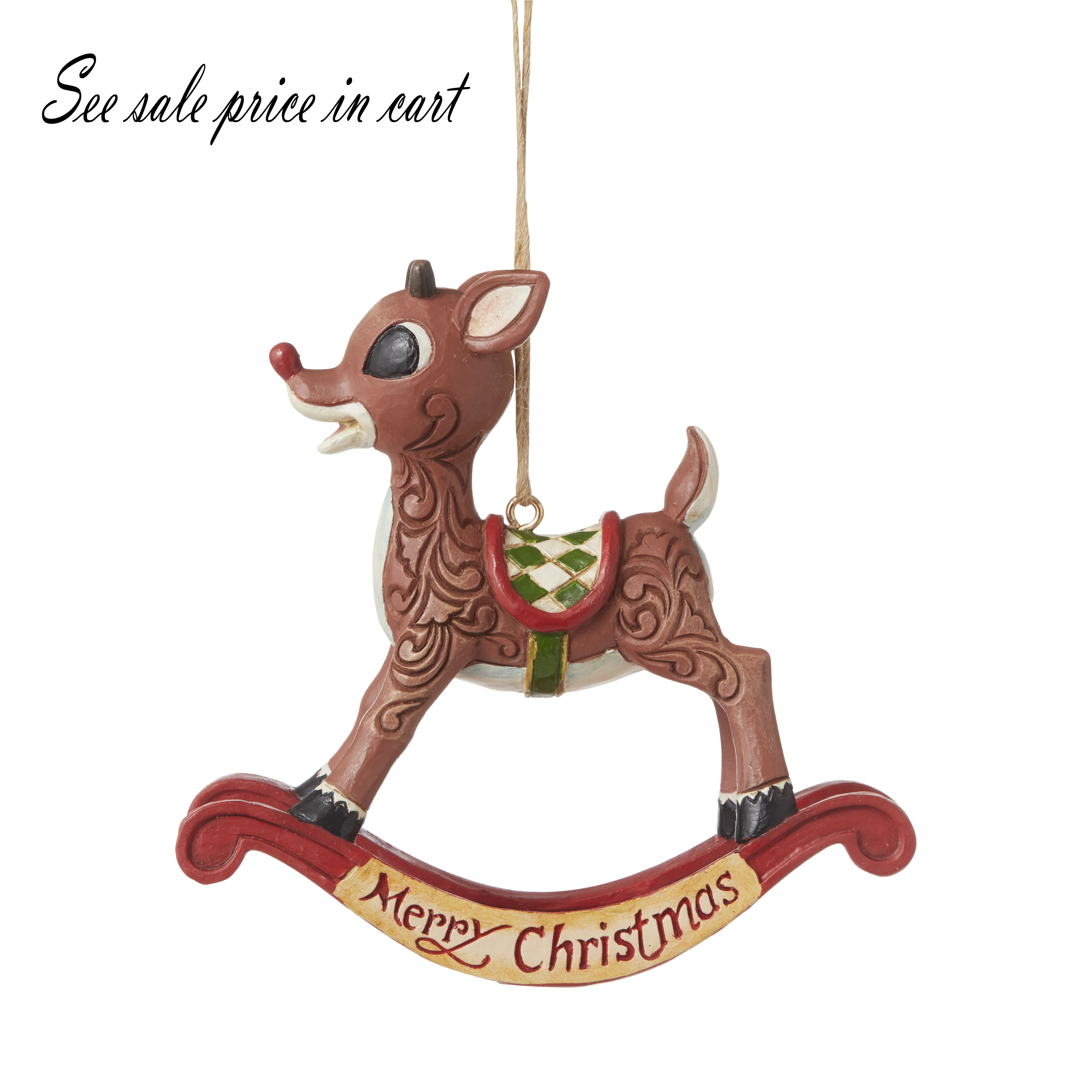 Celebrate the holiday season in style with a true Christmas classic, Rudolph the red-nosed reindeer. Crafted into a rocking horse, this beautiful Jim Shore ornament teeters with nostalgia. Rock around the Christmas tree with Rudolph.