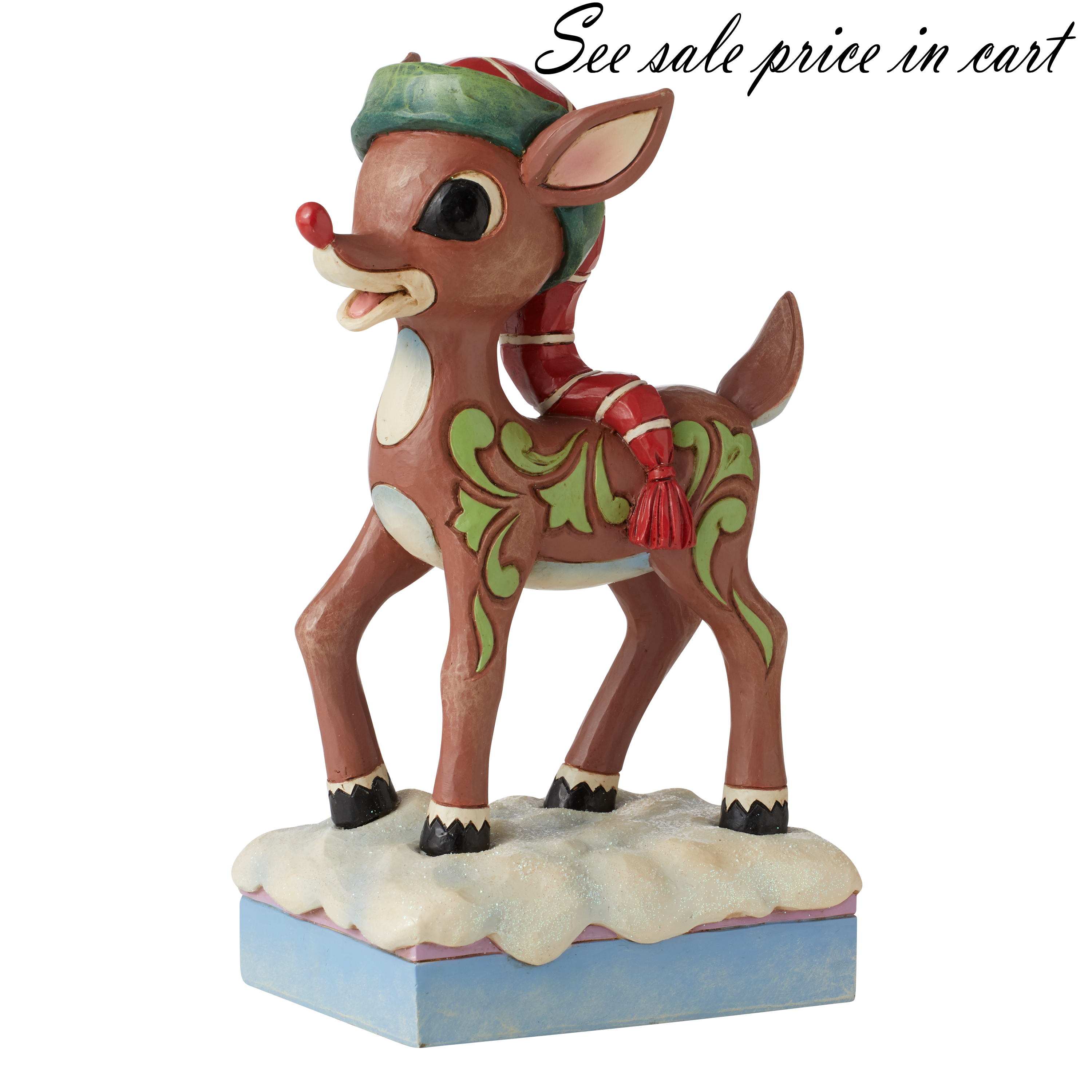 Everyone's favorite reindeer, Rudolph, wears an excited smile and long hat in this Jim Shore original. Hoofs tapping in the snow, he's having a great day at the North Pole. Red nose gleaming, Rudolph's coat is complimented with green rosemaling.