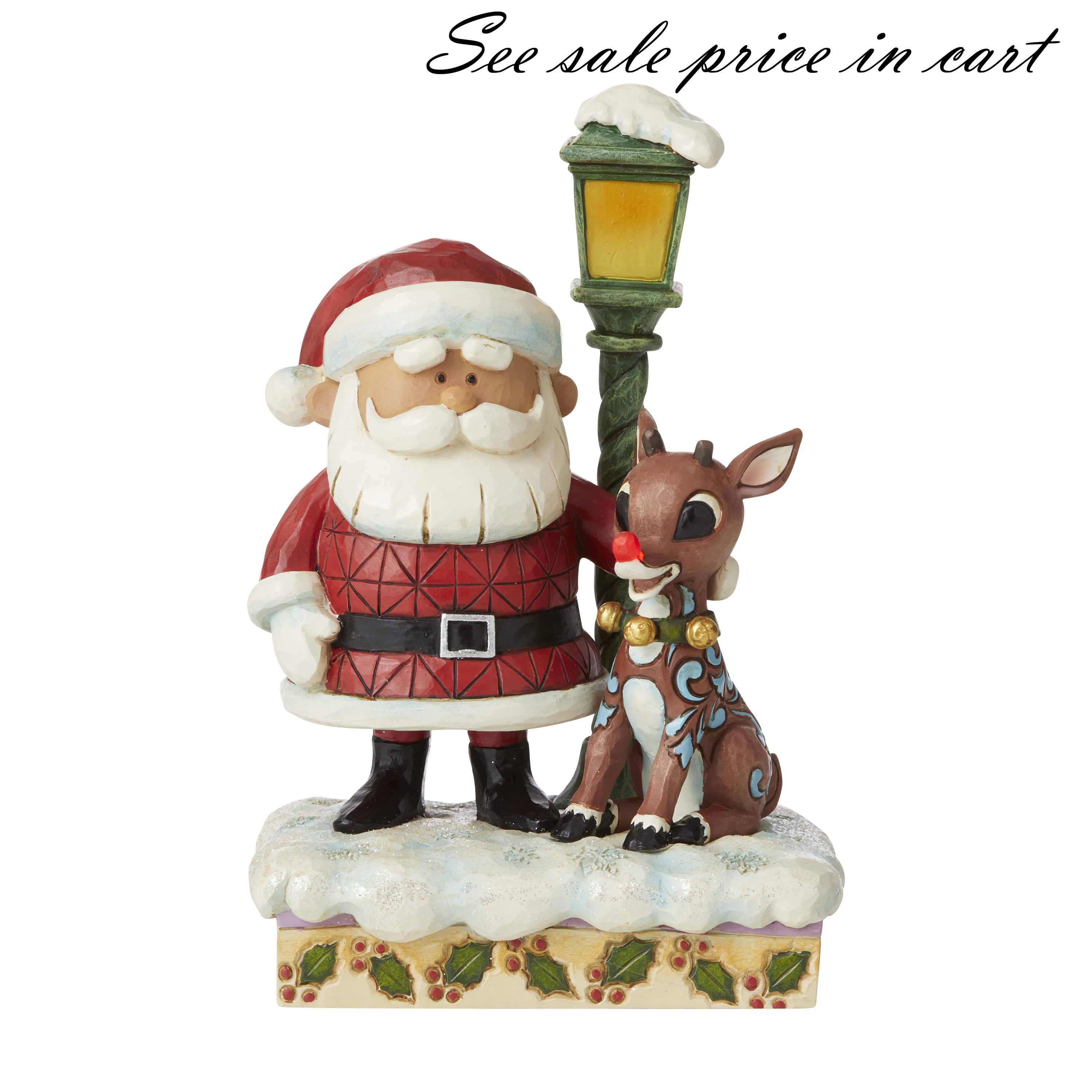On a snowy street, Santa congratulates his lead reindeer on a Christmas well guided in this Jim Shore classic. Patting Rudolph on the back, the little reindeer's nose lights up with joy. Wearing jingle bells, Rudolph and Santa stand by peacefully.