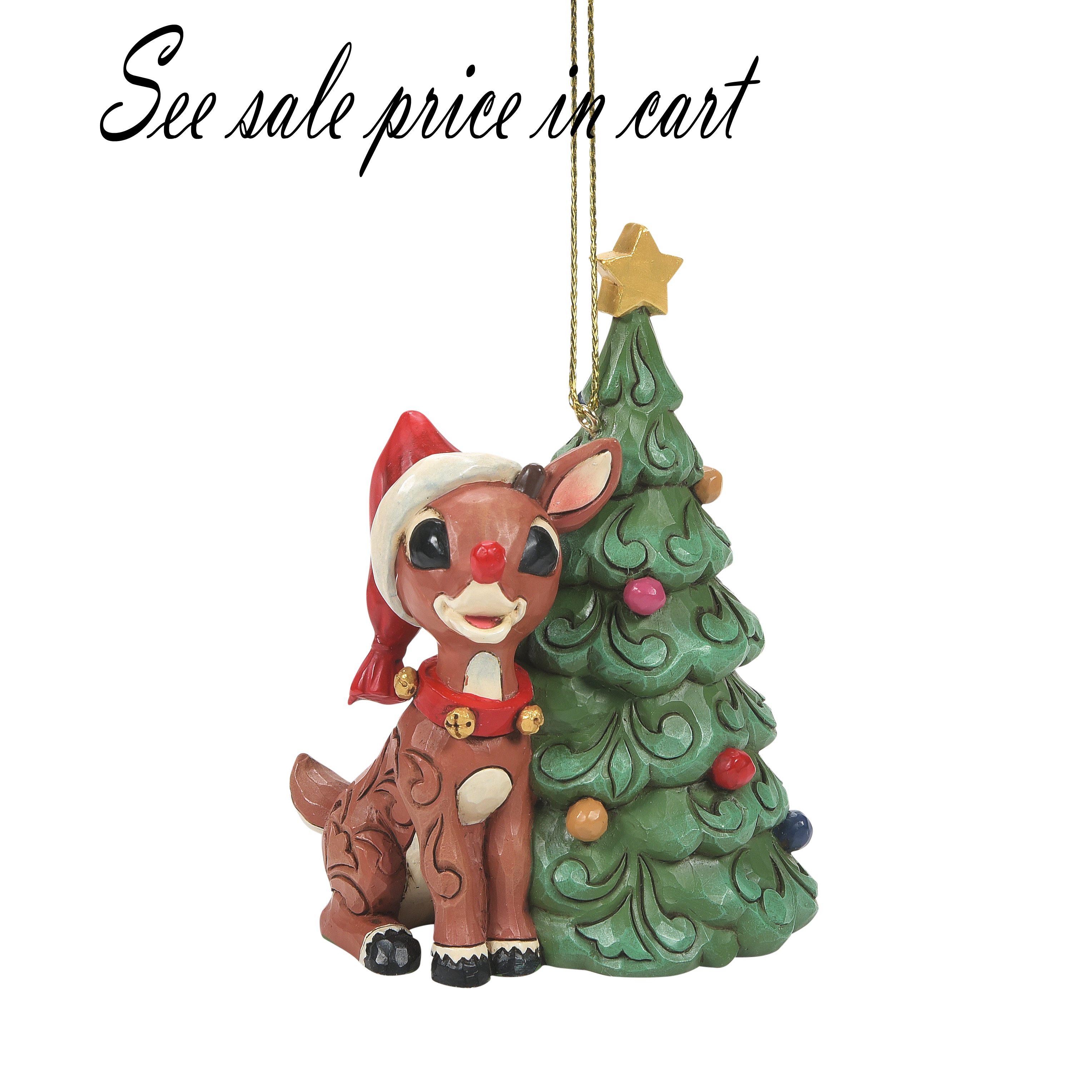 With a Santa hat over one ear, Rudolph the Red-Nosed Reindeer® looks extra adorable beside a dazzling Christmas tree. Presents wrapped in folksy print and colorful bows, Rudolph smiles excitedly. With unique Jim Shore rosemaling, this piece delights.