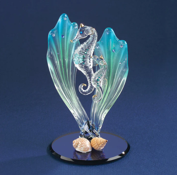 • Handcrafted glass sea horses swimming among the sea grass placed on a hand beveled blue glass mirror base