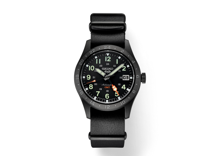 Seiko 5 Sports Field GMT. For decades, Seiko 5 Sports has delivered consistently high levels of reliability, durability, and performance. Equipped with automatic technology that you control with every movement, this versatile watch combines the clear and highly visible design elements of the Field style with the convenience of viewing the time in a second time zone. This timepiece is powered by a 24-jewel movement that beats at a frequency of 21,600 vibrations per hour, with a power reserve of approximately 41 hours and manual winding capability. Framed by a metalized black GMT bezel, the black dial features bold luminous hands and markers, a date calendar, and a large red-orange GMT hand for instant visibility. A black leather strap adds rich texture and wearability, while the coordinating stainless steel case with black hard coating includes a screwdown see-through caseback for a view of classic timekeeping in action. 10 bar, 100M Water Resistant.