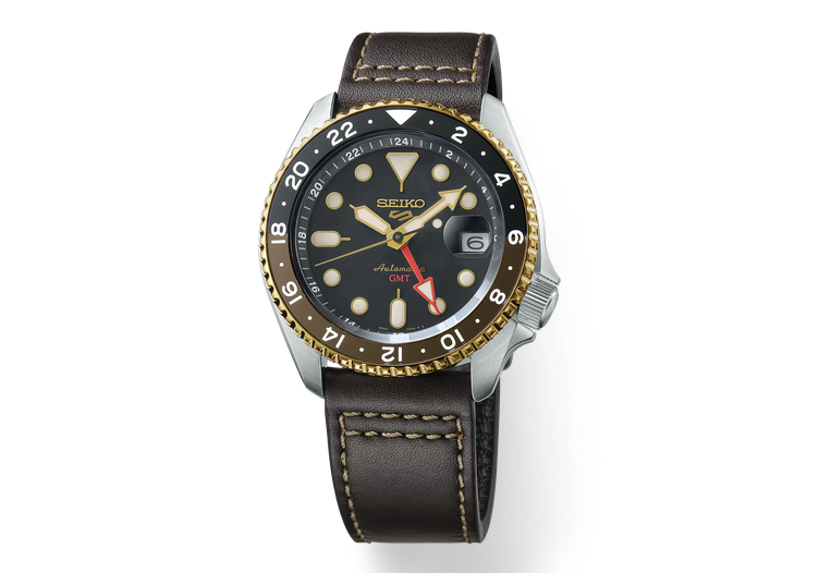 Seiko 5 Sports SKX Sports Style GMT Series. Adding new richness to classic sport/dress design, this dynamic watch offers a new variation on the popular “SKX” style. Equipped with automatic technology that you control with every movement, this versatile watch is powered by a 24-jewel movement that beats at a frequency of 21,600 vibrations per hour, with a power reserve of approximately 41 hours and manual winding capability. The black dial features bold luminous hands and markers and a magnified date calendar, as well as a large red GMT hand for instant visibility and is framed by a sleek gold, black, and dark brown GMT bezel. A brown leather strap, with contrast stitching, the first in the series, adds rich texture and wearability, while the stainless steel case includes a screwdown see-through caseback for a view of classic timekeeping in action. 10 bar, 100M Water Resistant.