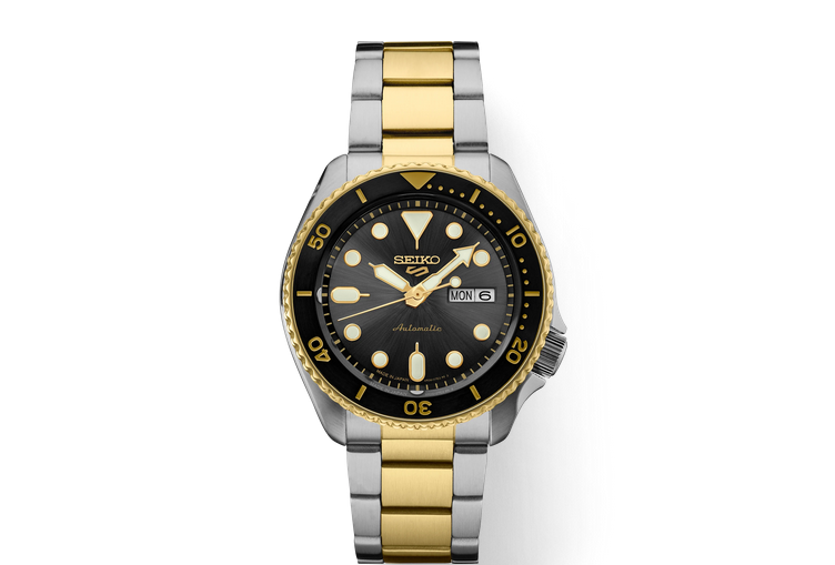 Seiko 5 Sports U.S. Special Creation. Adding new richness to classic sport/dress design, this stylish watch, delivers all-day versatility with a cutting edge. Providing automatic technology that you control with every movement, this dynamic timepiece is powered by a 24-jewel movement that beats at a frequency of 21,600 vibrations per hour, with a power reserve of approximately 41 hours and manual winding capability. Framed by a black uni-directional rotating elapsed timing bezel, the sunray-finish charcoal gray dial features luminous hands and markers, and a date/day calendar. Crafted of stainless steel in two-tone finish, this exceptional watch includes a tri-fold push button release clasp with lock, as well as a screwdown see-through caseback for a view of classic timekeeping in action. 10 bar, 100M Water Resistant.