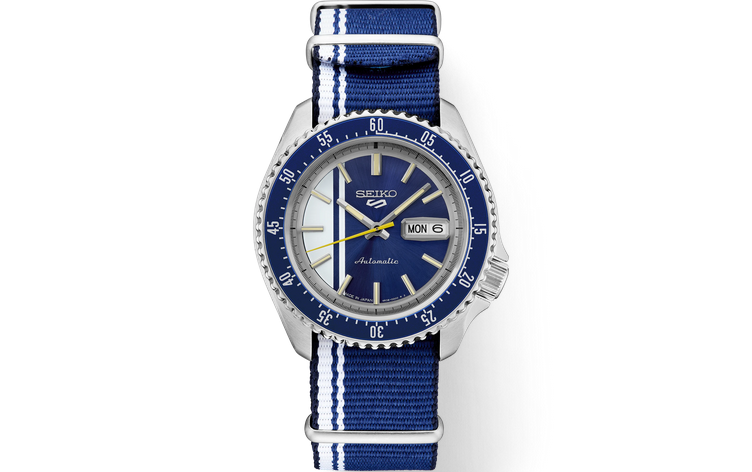 Seiko 5 Sports U.S Special Creation. With vivid colors and bold design inspired by the stripes of vintage race cars, this dynamic watch delivers both memorable styling and durability. For added impact, the blue and white stripes flow from the dial to the coordinated nylon strap, sized to fit easily over a racing uniform. Framed by a blue uni-directional rotating bezel, the dial also offers a day/date calendar, yellow second hand, and luminous hands and markers. Providing automatic technology that you control with every movement, this memorable timepiece is powered by a 24-jewel movement that beats at a frequency of 21,600 vibrations per hour, with a power reserve of approximately 41 hours and manual winding capability. The case, in stainless steel, includes a screwdown see-through caseback for a view of classic timekeeping in action. 10 bar, 100M Water Resistant.