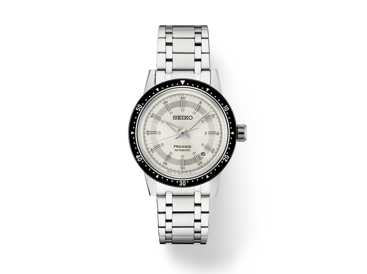 Presage Style 60s Crown Chronograph 60th Anniversary Limited Edition. Available only in a controlled-run of 5,000, with the production serial number engraved on each caseback, this exceptional Limited Edition blends the finest in Japanese mechanical watchmaking with superior craftsmanship and design. Celebrating the fresh spirit of the 1960s, this design is an homage to Seiko’s 1964 “Crown Chronograph,” Japan’s first watch with a stopwatch function. The dial inherits the original layout, color, and finish while the bracelet features a combination hairline and mirror finish and look and feel similar to the 1964 model. Framed by a black bezel, the light beige dial includes a date calendar and LumiBrite hands and markers. The screwdown see-through caseback provides a view of the 23-jewel automatic movement with manual winding capability, a frequency of 21,600 vibrations per hour and a power reserve of approximately 41 hours. Crafted of stainless steel, this distinctive timepiece includes a box-shaped crystal and tri-fold push button release clasp, and is presented in a vintage inspired Limited Edition collector’s box. 5 bar, 50M Water Resistant