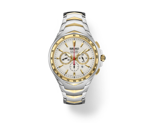 From the Coutura Collection. Delivering the perfect blend of technology and design for those on the move, the Coutura Collection combines bold angularity and shading with superior timekeeping for effortless sport/dress style. Inspired by vintage chronograph design, this dynamic watch is crafted of stainless steel in two-tone finish, with screwdown caseback, sapphire crystal, gold tachymeter bezel and classic cabochon crown. In white, with pressed pattern and gold accents adding a rich dimensionality, the multi-layer dial features three subdials, a date calendar, and LumiBrite hands and markers. The chronograph function offers timing to 60 minutes in 1/5-second increments with split time measurement. 10 bar, 100M Water Resistant.