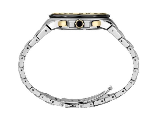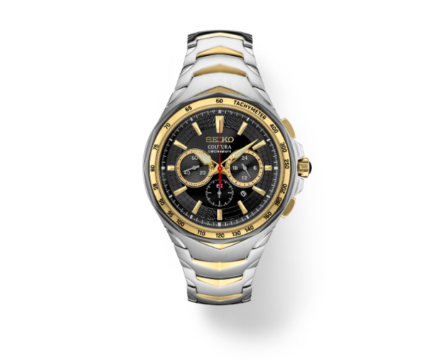 From the Coutura Collection. Delivering the perfect blend of technology and design for those on the move, the Coutura Collection combines bold angularity and shading with superior timekeeping for effortless sport/dress style. Inspired by vintage chronograph design, this dynamic watch is crafted of stainless steel in two-tone finish, with screwdown caseback, sapphire crystal, gold tachymeter bezel and classic cabochon crown. In black, with pressed pattern and gold accents adding a rich dimensionality, the multi-layer dial features three subdials, a date calendar, and LumiBrite hands and markers. The chronograph function offers timing to 60 minutes in 1/5-second increments with split time measurement. 10 bar, 100M Water Resistant.