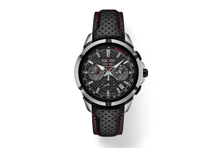 From the Coutura Collection. Delivering the perfect blend of technology and design for those on the move, the Coutura Collection combines bold angularity and shading with superior timekeeping for effortless sport/dress style. Inspired by motor sports, with a new case design incorporating the angles and edges of racecar architecture, this dashingly sculpted chronograph features a multi-layer carbon-fiber patterned black dial styled to suggest a dashboard, with prominent 24-hour and chronograph minute subdials at 3 and 9 o’clock, tachymeter outer ring, date calendar, and LumiBrite hands and markers. Applied markers and subdial rings add a rich dimensionality, while the black accents punctuating the bezel provide a sense of propulsive action. Designed to echo driving gloves, the black perforated leather strap includes red contrast stitching and a tri-fold push button release clasp. With a stainless steel case, this dynamic watch includes a sapphire crystal, screwdown caseback, and classic cabochon crown. The chronograph function offers timing to 60 minutes in 1/5-second increments with split time measurement. 10 bar, 100M Water Resistant.