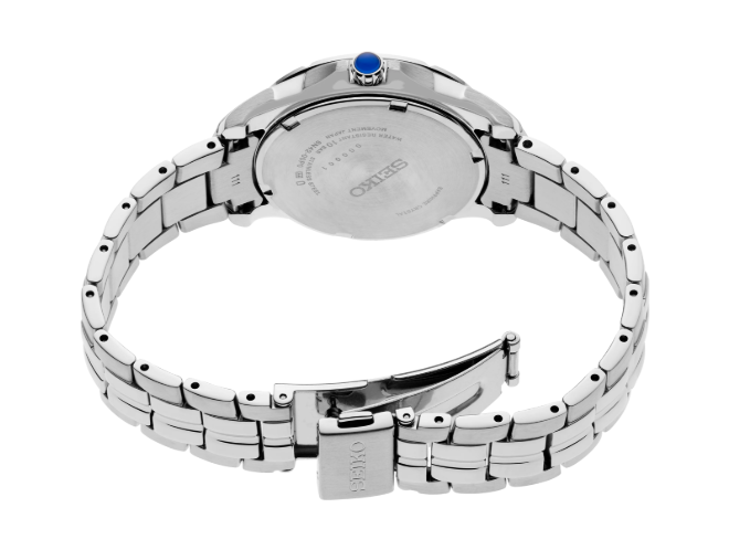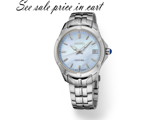 From the Coutura Collection. Expressing a polished and modern sophistication, the Coutura Collection combines bold angularity and elegant design with superior timekeeping for an effortless sport/dress aesthetic. This versatile timepiece, perfect for day-to-night style, features a shimmering pale blue mother-of-pearl dial with silver applied indices, adding a rich 3-dimensional appearance to the elegant look. Crafted of stainless steel, with a perfectly proportioned case and bracelet for a streamlined fit, this graceful watch is topped with a scratch-resistant sapphire crystal and includes LumiBrite hands and markers, a date calendar, a classic cabochon crown, and a tri-fold push-button release clasp. 10 bar, 100M Water Resistant.