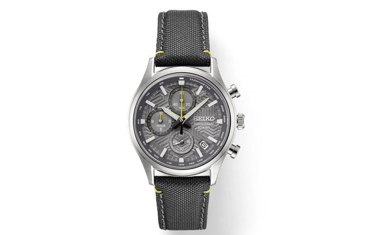From the Essentials Collection. Designed to evoke the cool excitement of a night run, this smooth chronograph offers a slim profile for sleek sport or everyday wear. In a modern gray monochromatic color scheme, this subtly updated watch adds a streetwear edge with the y-shaped shoe-sole pressed pattern on its matte textured gray dial. With three subdials and a date calendar, the dial also features LumiBrite hands and markers. Chronograph timing provides measurement of up to 12 hours of elapsed time in 1/5-second increments. With a stainless steel case, this distinctive timepiece includes a secure screwdown caseback, scratch-resistant sapphire crystal and rugged nylon/leather strap with vivid yellow accent stitching. 10 bar, 100M Water Resistant.