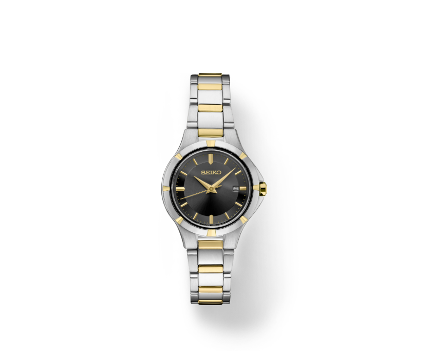 From the Essentials Collection. Offering classic designs, the Essentials Collection provides the ideal solution for all-day wear. With precisely sculpted stainless steel case and bracelet in versatile two-tone finish, this perfectly minimalist watch features a rich charcoal sunray dial with gold hands and stick markers, as well as a date calendar, for a superb blend of clarity and style. 10 bar, 100M Water Resistant.