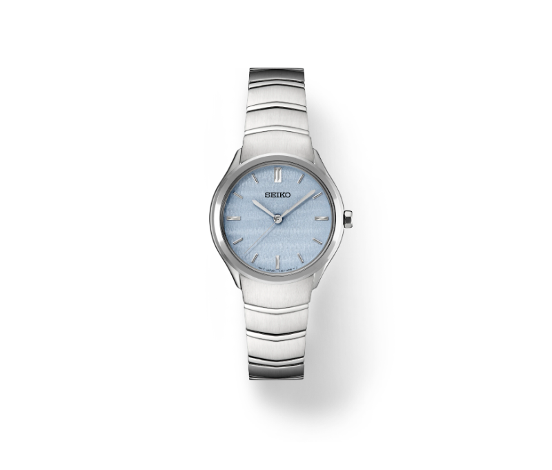 From the Essentials Collection. With sleek sophistication, this distinctively modern watch makes an immediate style statement. The clean, minimalist dial, in pale blue with simple stick markers, features a subtly varying metallic texture for added visual interest, while the soft curves of the bracelet are highlighted by a mirror and hairline finish. In stainless steel, this memorable timepiece includes a tri-fold push button release clasp. 5 bar, 50M Water Resistant.
