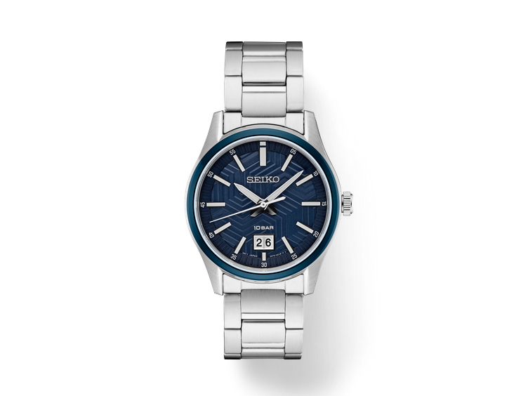 From the Essentials Collection. Designed to evoke the cool excitement of a night run, this smooth watch offers a slim profile for sleek sport or everyday wear. This subtly updated watch adds a streetwear edge with the y-shaped shoe-sole inspired pressed pattern on its matte textured blue dial. With big date calendar and LumiBrite hands and markers, this distinctive timepiece features a stainless steel case, secure screwdown caseback, scratch-resistant sapphire crystal and stainless steel bracelet that secures with a tri-fold push button release clasp. 10 bar, 100M Water Resistant.